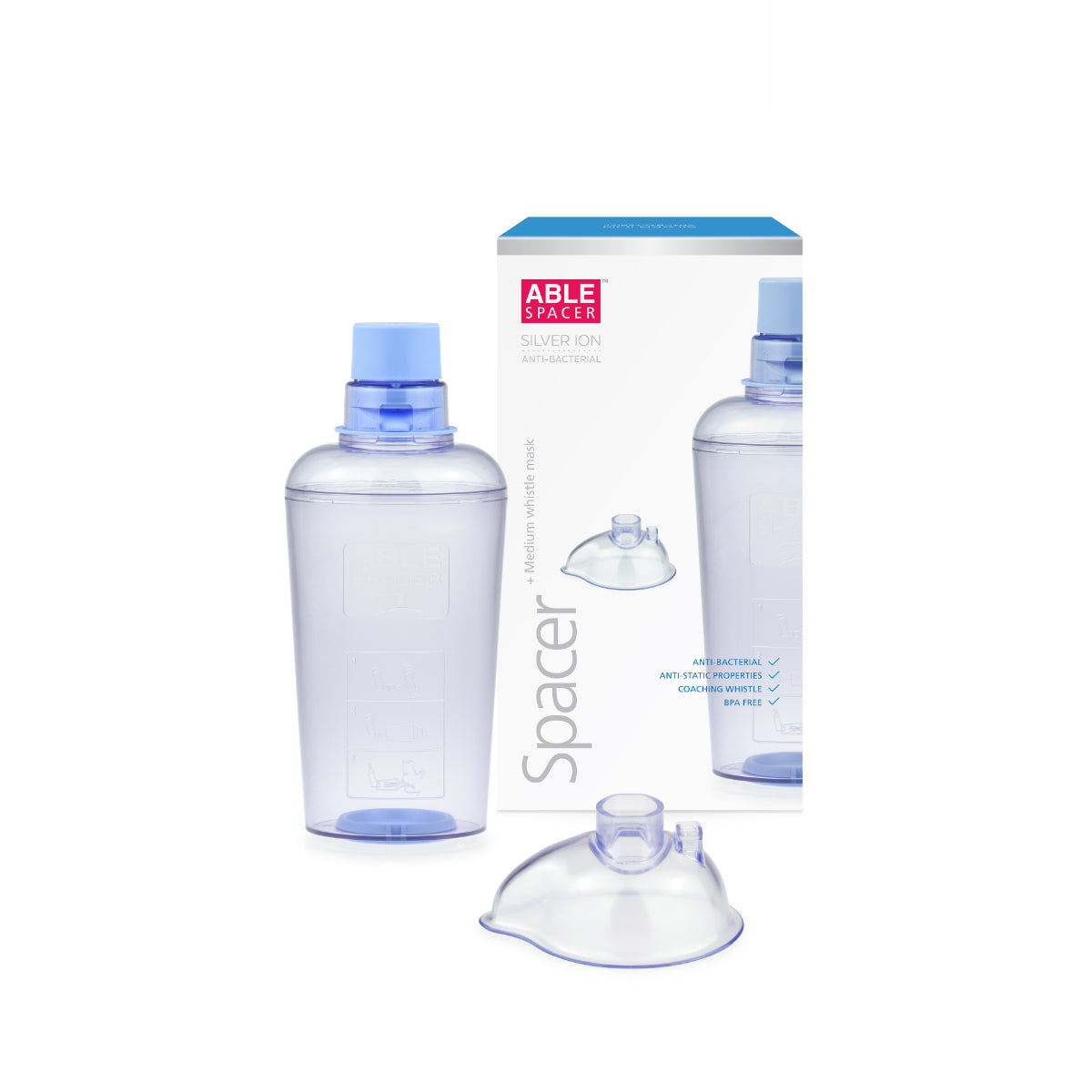 ABLE Health's Spacer with Medium Whistle Mask is embedded with silver ion to protect against 99% of all harmful bacteria (demonstrated by ISO 22196 tests)....