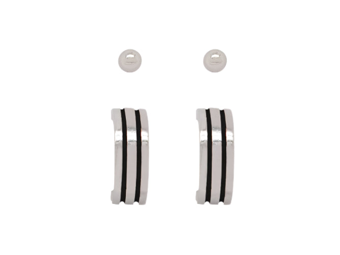 A versatile duo combines spherical studs with sleek hoops that work together or separately for varied looks. The rhodium-coated finish delivers a polished, cool-toned gleam...