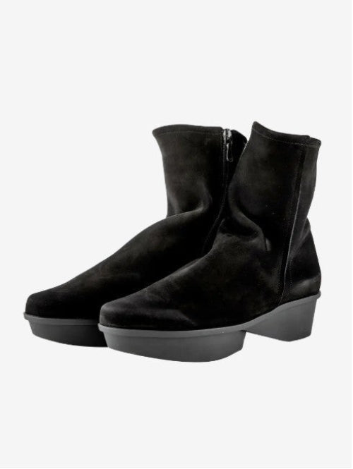 Sleek black mid-calf boots that offer a modern silhouette and comfort. Soft leather construction ensures a flexible fit while the sturdy sole supports all-day wear....