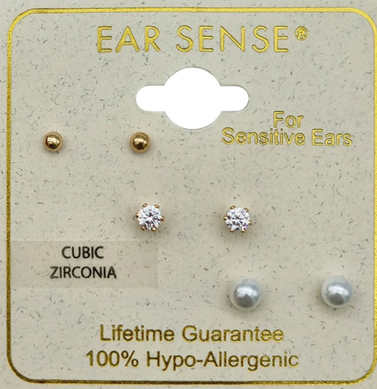 This set of hypoallergenic earrings combines timeless style and comfort for sensitive ears. Features • Includes three pairs: gold ball, CZ stud, and pearl stud...