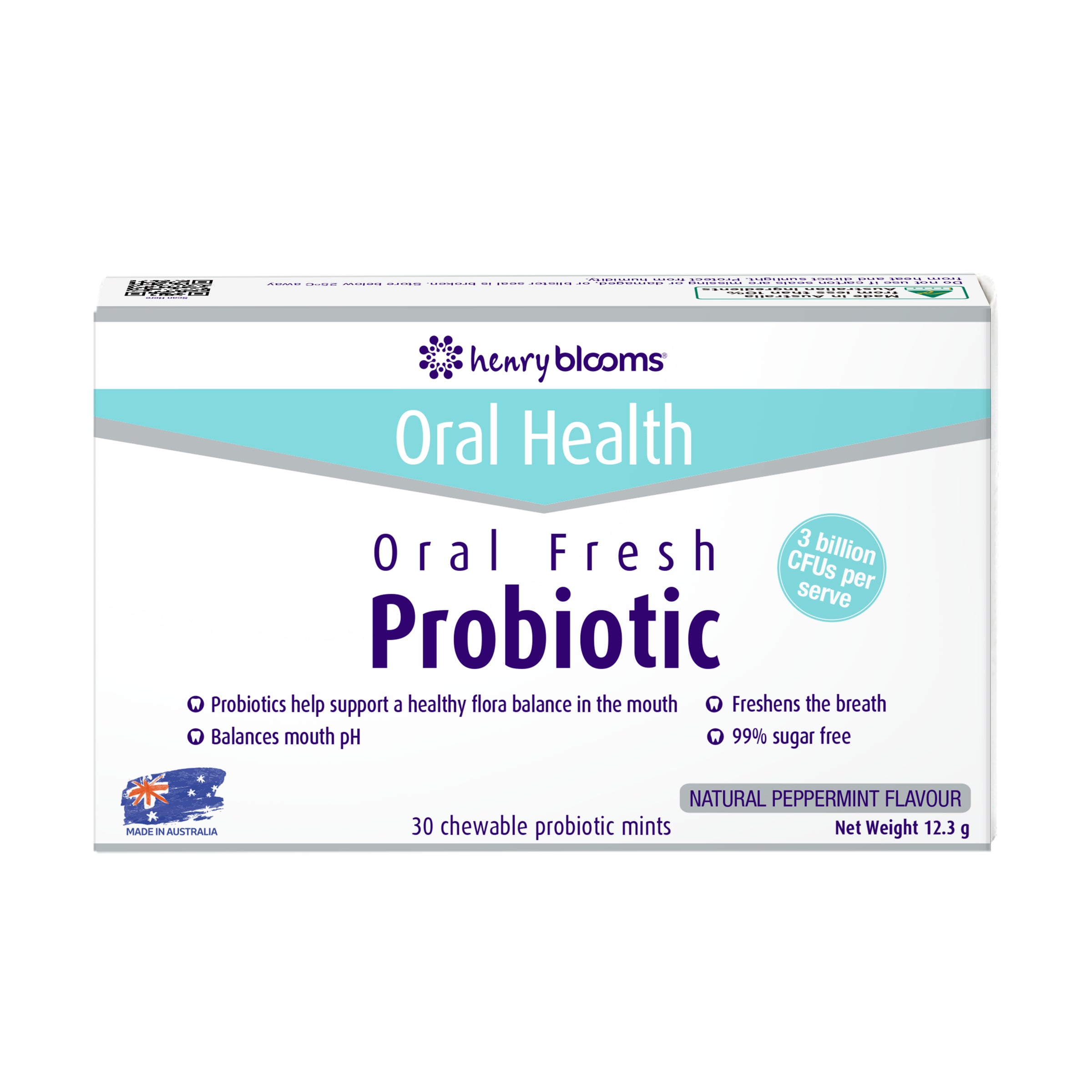 Henry Blooms Oral Fresh Probiotic mints freshen your breath, naturally balance the delicate pH in the mouth and help fight acids formed by plaque 99.9%...