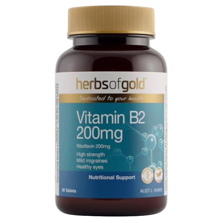 HERBS OF GOLD Vitamin B2 200mg is a high-strength, one-a-day formula designed to support energy production and reduce the frequency of migraines. This supplement assists in the metabolism of carbohydrates, fats, and proteins, while also providing antioxidant support to reduce free radicals in the body. Vitamin B2 is essential for maintaining healthy eyes, skin, and hair.