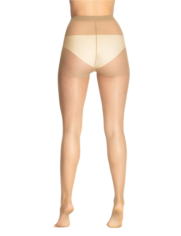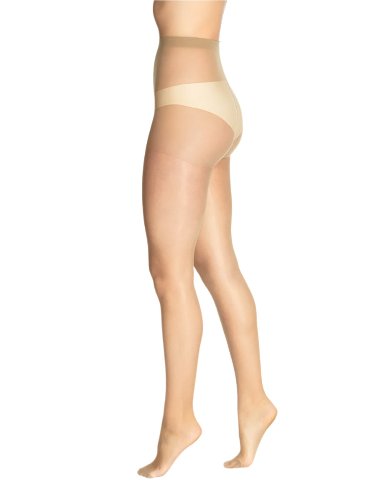 Shimmery 12 denier pantyhose in Visone tailored for taller frames—featuring comfort brief, cotton gusset, and reinforced toe for elegance and durability.