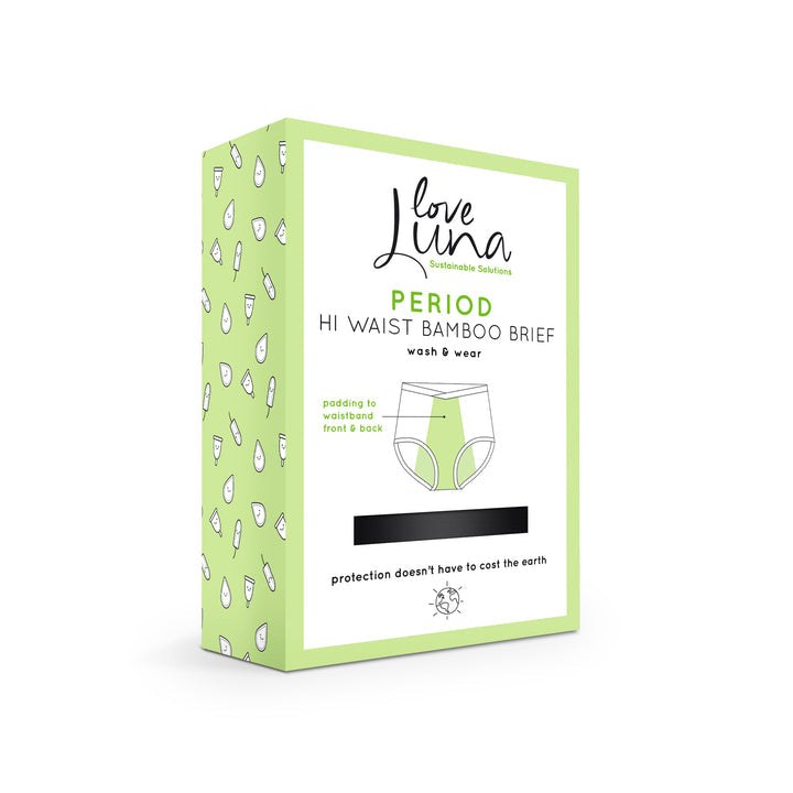 High-waist bamboo-period brief offering full front-to-back absorbent protection, ideal for medium-heavy flow, with breathable bamboo-rich fabric and discreet, eco-conscious design. Features Seam-to-seam four-layer absorbent padding...