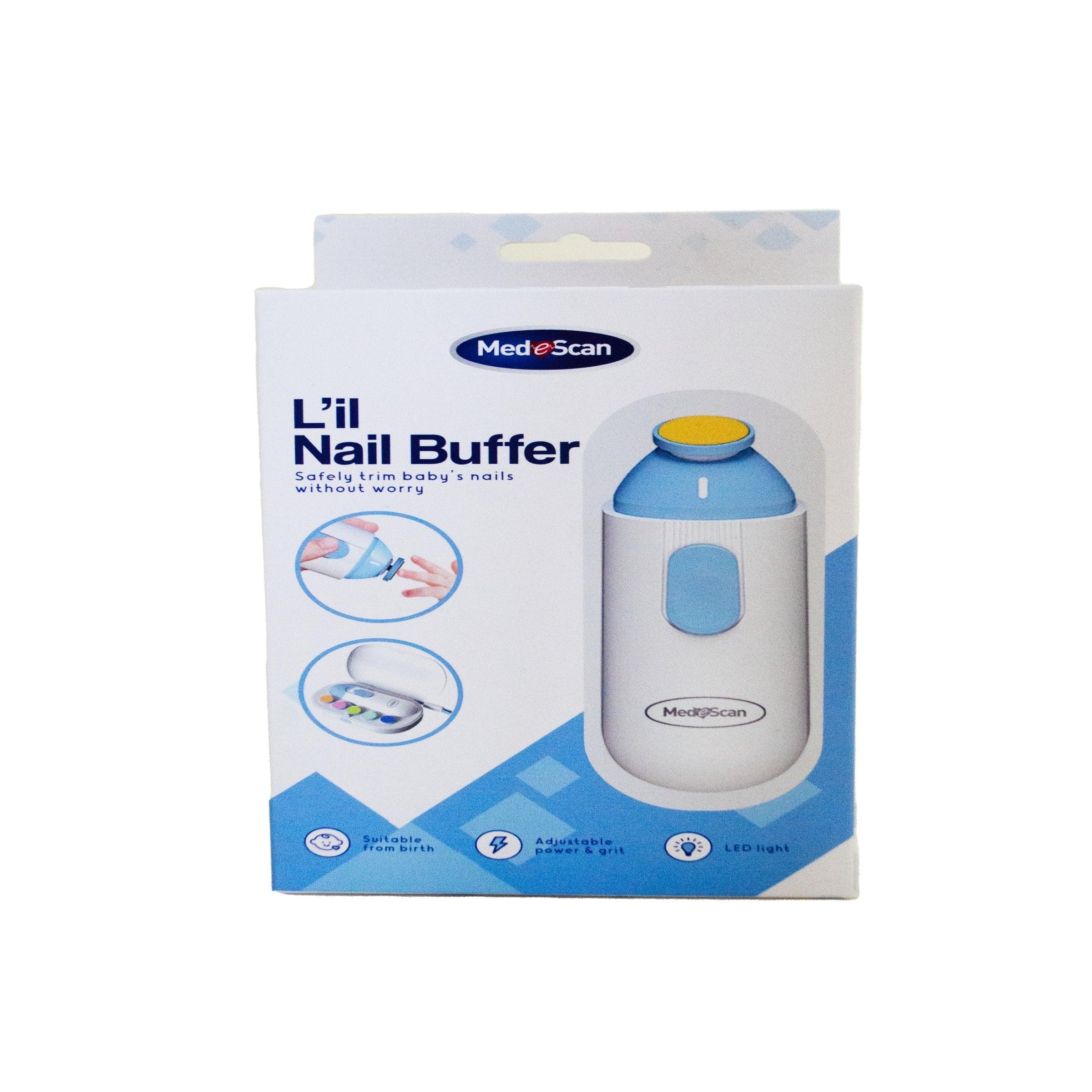 Nail cutting is made easy with Medescan's L'il Nail Buffer. Designed for the safe and gentle trimming of delicate nails, making it ideal for use on babies and suitable for all ages. This product features an almost silent operation and is equipped with an LED light for added safety. It comes with five different buffer heads to cater to various ages, ensuring versatility. The package includes a convenient and stylish carry case with a handy strap, a clean protective cover, and batteries (2 x AA) are provided for immediate use. This nail buffer combines ease of use with safety, making it a perfect tool for family nail care.