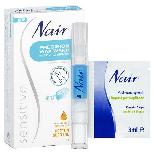 The Nair Sensitive Precision Wax Wand is especially formulated for people with sensitive skin to quickly and precisely remove unwanted hair from the face, eyebrows and sensitive areas. Wand: Polycyclopentadiene, Gossypium Oil (Cotton Seed Oil), Cera Microcristallina, Parfum, Mica, Titanium Dioxide, CI 74160.