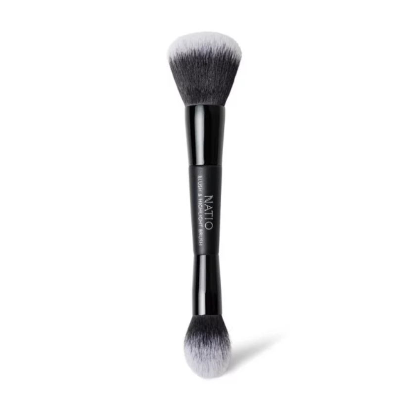 Seamlessly apply blusher and highlighter with this multi-functional, double-ended brush. Featuring both a large fluffy brush end and a more dense, domed brush end for both broad and precise application, it’s a multi-tasking makeup bag must-have. Premium synthetic bristles gently disperse pigment, for a soft, airbrushed finish.