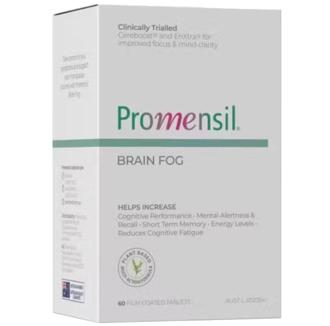 Promensil BRAIN FOG contains clinically trialled patented ingredients Cereboost® (American ginseng extract) and (Galangal extract) to support mental function and reduce cognitive fatigue and Green Tea to increase energy levels.