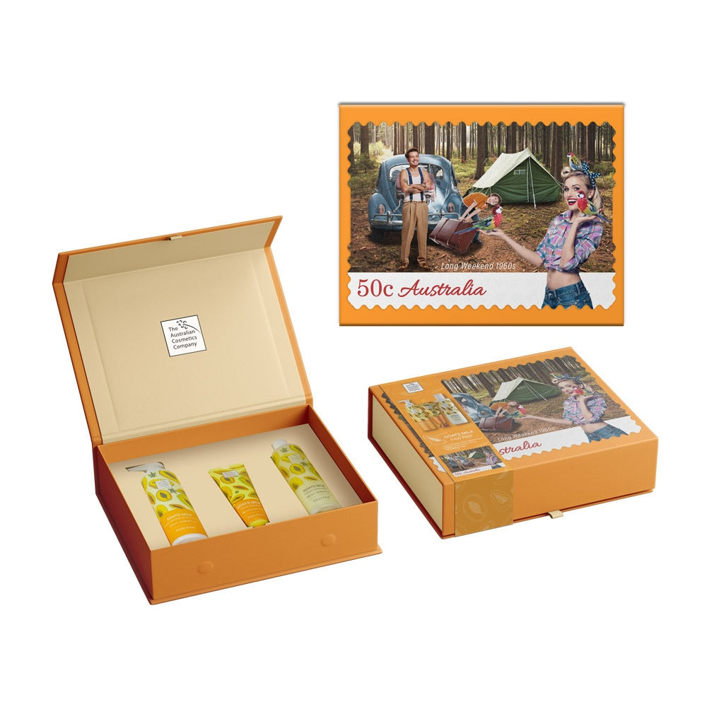 Revitalise your skincare routine with The Australian Cosmetics Company Body Wash, Body Cream, and Hand Cream Postage Stamp GiftSet. Enjoy the invigorating sensation of the body wash, followed by the nourishing touch of the body cream and finish with the hand cream.Leaving your skin feeling refreshed and rejuvenated. Experience the luxury of this comprehensive set for a revitalising self-care experience. To celebrate our Australian heritage, The Australian Cosmetics Company have created vintage Australian postage stamp themed keepsake gift boxes! Each keepsake gift box features a unique design for the decades of 50Õs to the 90Õs and are filled with our high quality Australian Made products.