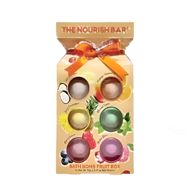 Indulge in a vibrant and refreshing bath experience with The Nourish Bar Bath Bomb Fruit Box. This delightful collection features an assortment of fruit-inspired bath...